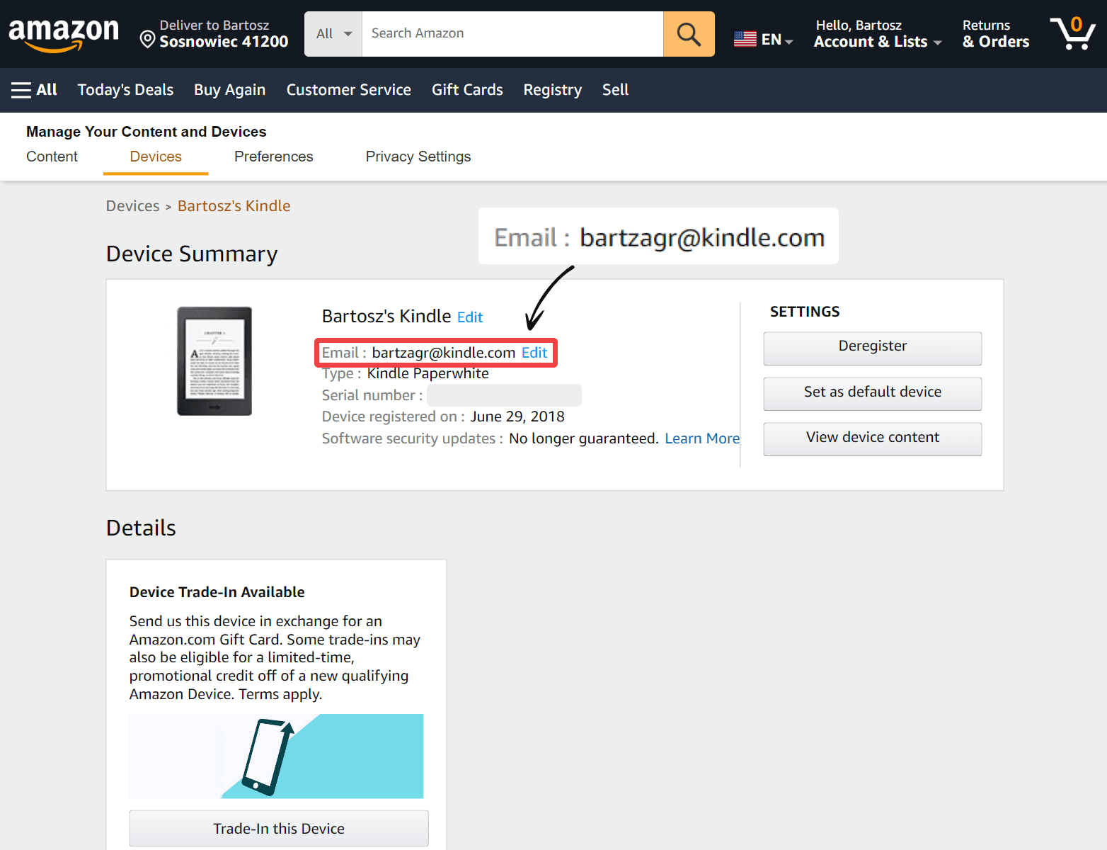 Go to Manage Your Content & Devices > Preferences > Personal Document Settings > Approved Personal Document E-mail List