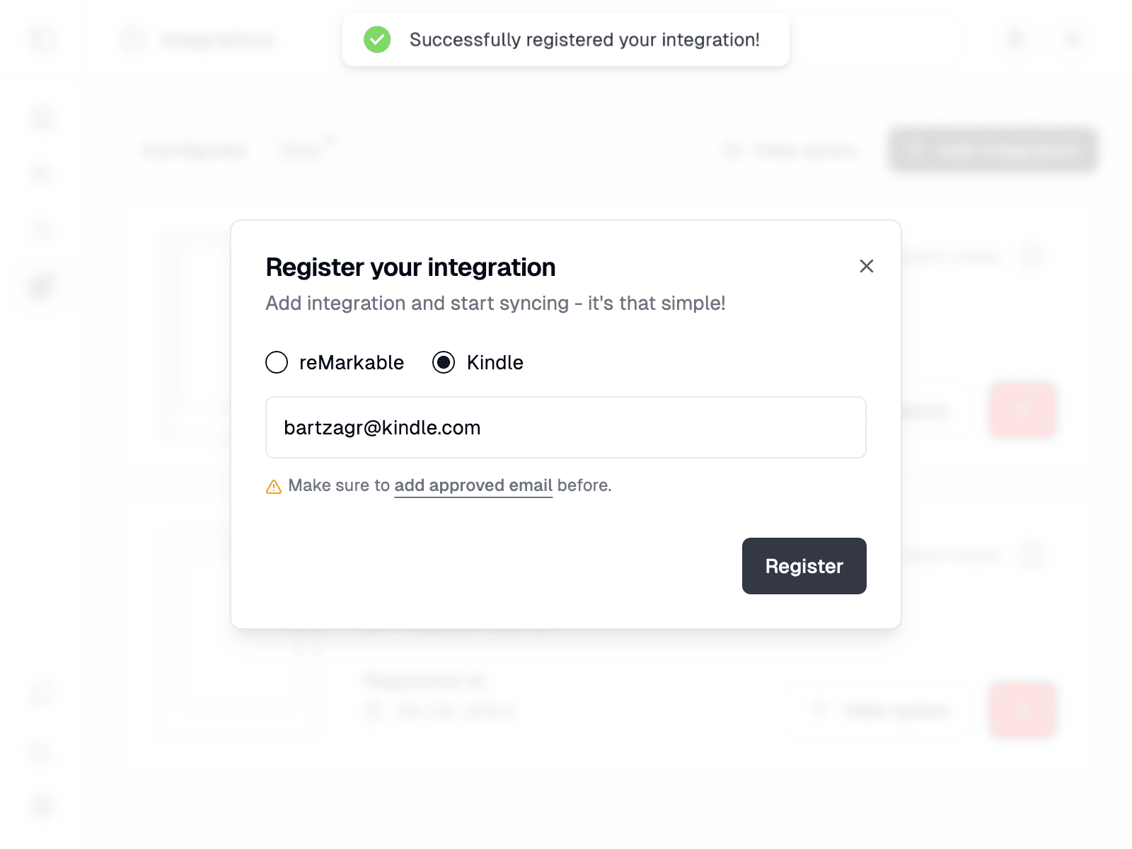 Login to dashboard and register your integration using your Kindle email (ends with @kindle.com). That's really simple!